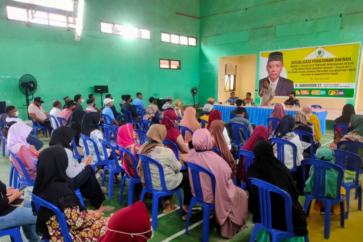 Paser (ANTARA) - Legislator Dewan Perwakilan Rakyat Daerah (DPRD) Provinsi Kalimantan Timur Amiruddin menggelar sosialisasi Peraturan Daerah (Perda) No.1 tahun 2019 tentang pajak daerah di aula Kecamatan Kuaro, Kabupaten Paser, Sabtu (25/6).